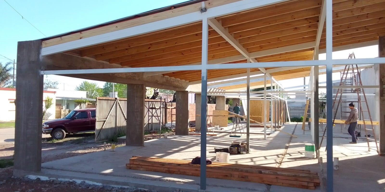 Comienza la etapa de techado en la construcción del Centro de Desarrollo Infantil. Se coloca un revestimiento de cielorraso con madera OSB, seguido de un aislante térmico y chapa de zinc hacia el exterior. Estas distintas capas del techo se colocan de forma simultánea, lo que permite avanzar más rápidamente. Tras finalizar esta etapa se continuará con los laterales.