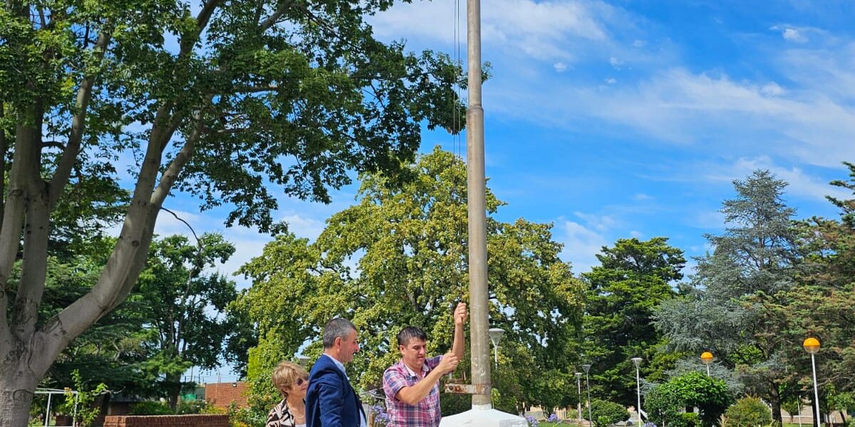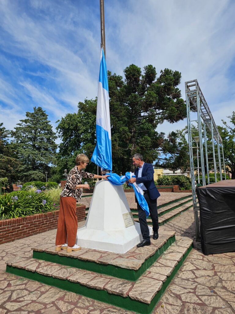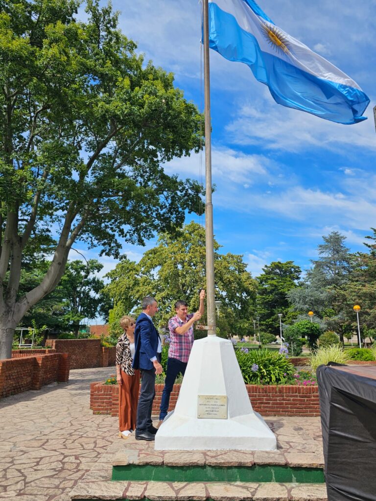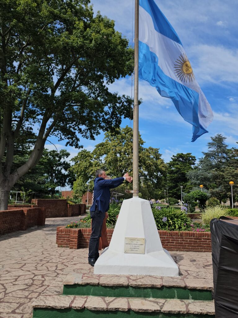 Esta mañana se realizó un pequeño acto de izamiento de la bandera nacional en el mástil de Plaza San Martín, el conmemorativos del 134 Aniversario de fundación de Gobernador Mansilla.