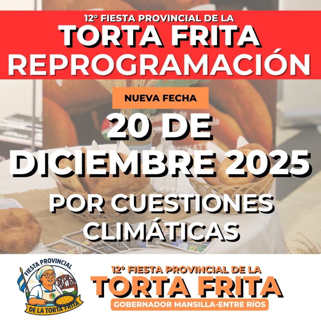Debido a las condiciones climáticas, la 12° Fiesta Provincial de la Torta Frita ha sido reprogramada.