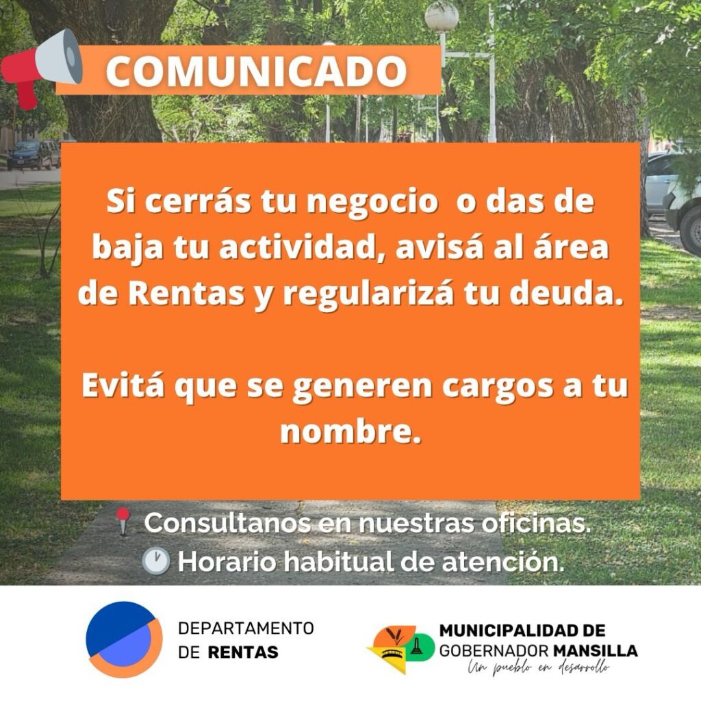 Si cerrás tu negocio o das de baja tu actividad, recordá comunicarlo al área de Rentas y regularizar tu situación para evitar cargos innecesarios.