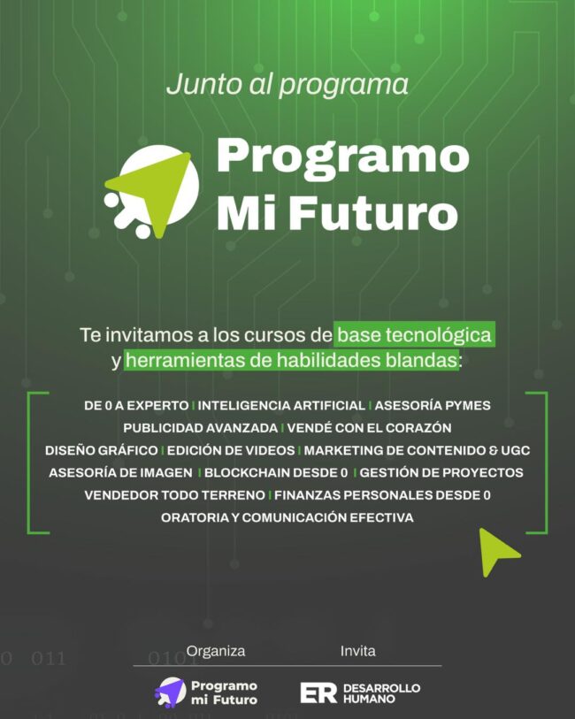 Te invitamos a sumarte a Programo Mi Futuro, una propuesta de 14 cursos gratuitos de base tecnológica y desarrollo de habilidades blandas. 100% gratuitos 100% virtuales Abiertos a todo público Inscribite ahora a través del link: https://programomifuturo.com/.